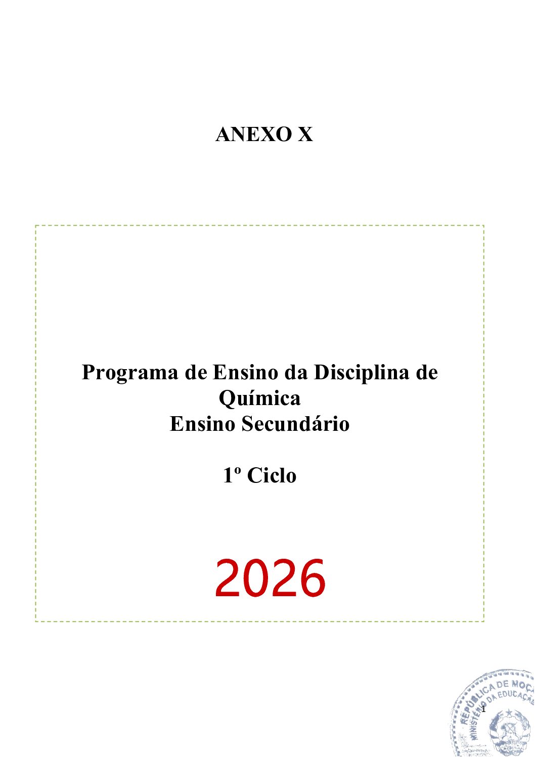 O Programa de Ensino da disciplina de Química do 1º Ciclo do Ensino Secundário, presente no Anexo X, é um documento oficial elaborado pelo Ministério da Educação e Cultura de Moçambique.